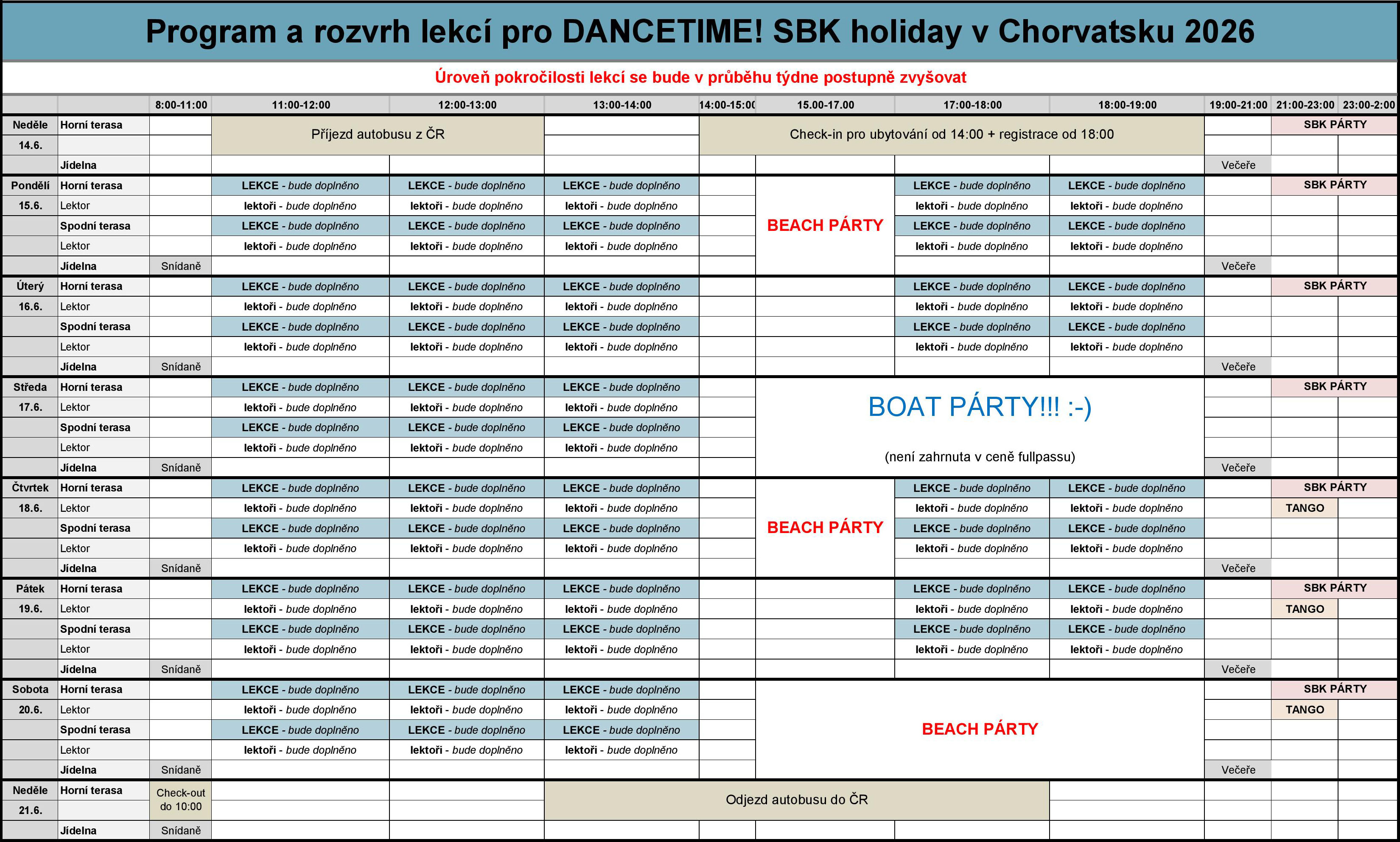 Fullpass zahrnuje 7 nočních párty, speciální tančírny, 26 lekcí ve 2 sálech a odpolední plážové párty.